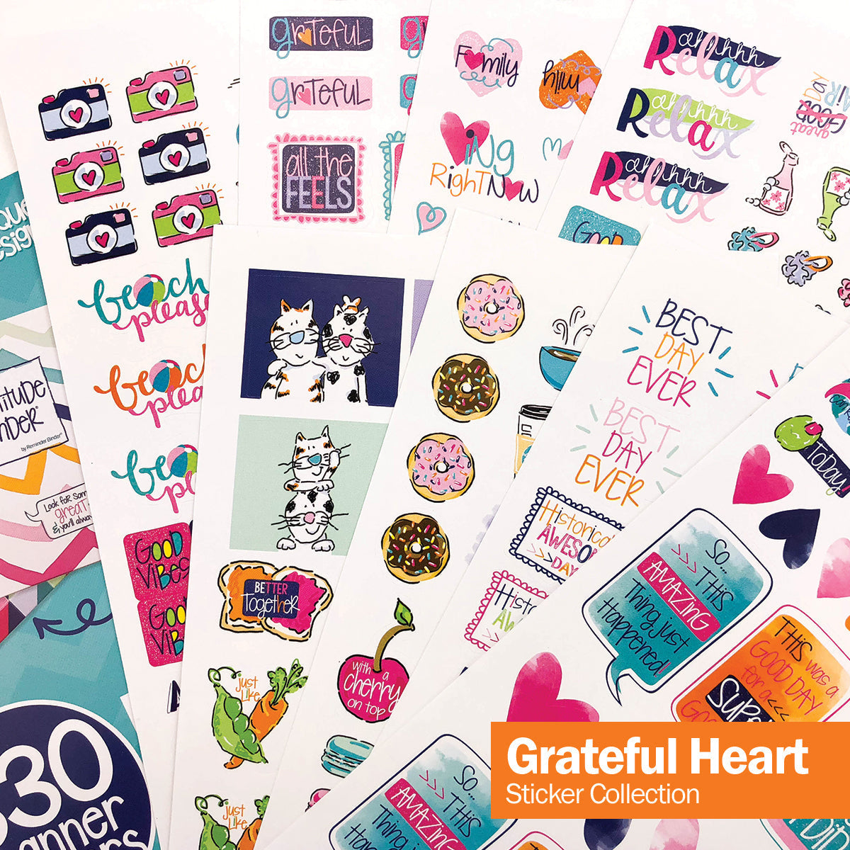 - Grateful Heart Stickers (330 stickers) - elevate your attitude of gratitude with these adorable stickers including designs like darling sayings like "I can't even", postworthy, celebration/party, Best Day Ever, Good Hair Day, I Love Today, This is Us, Nailed It, my Happy Place, Crushed it, Best friends, Forever Friends, Like a Boss, My heart melted, travel, relax, Good Vibes, Life is Amazing, pineapples, coffee & flamingos, too!