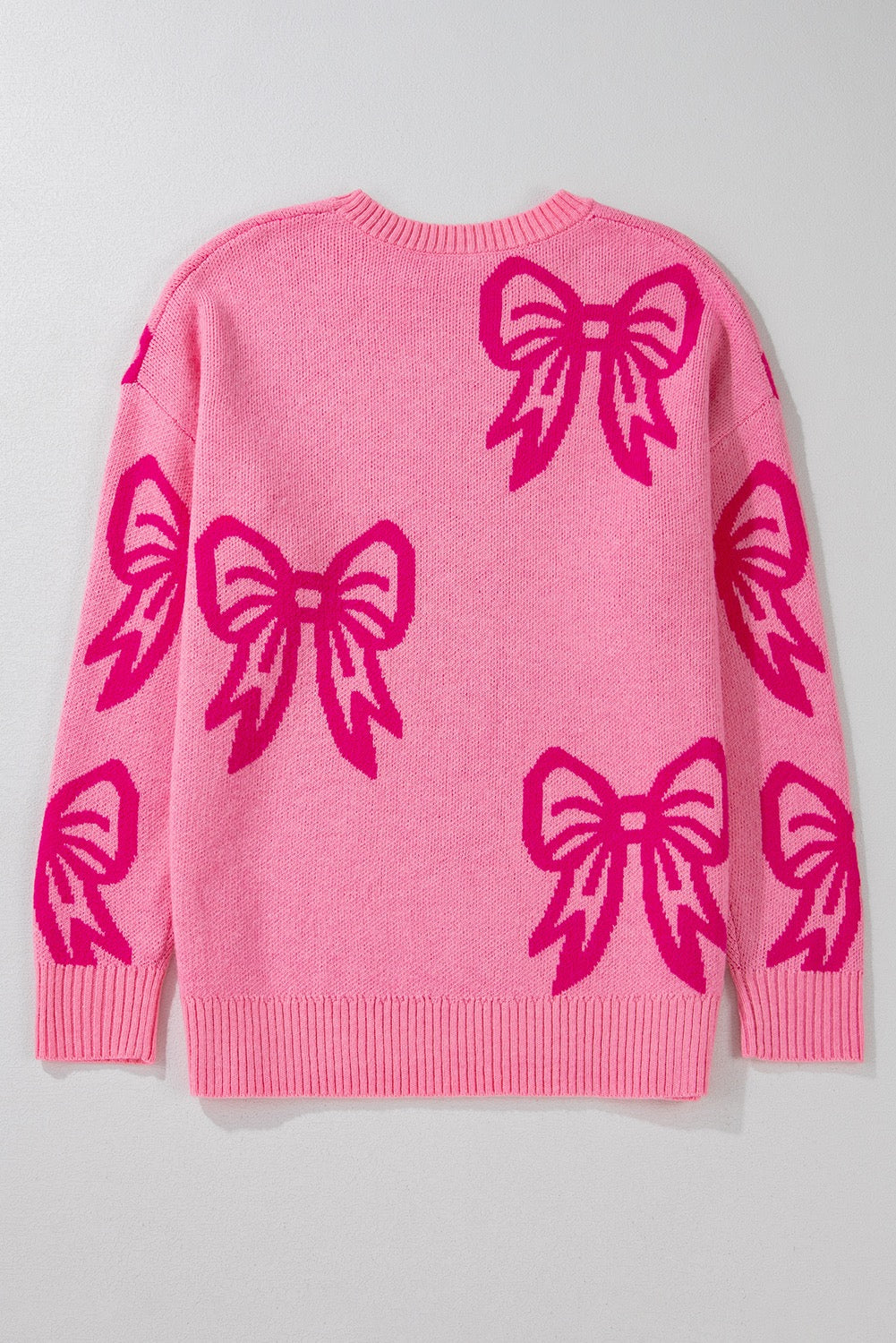 Elevate your style with our Pink Bow Pattern Sweater. Its light pink color is accented by a big dark pink bow print, adding a delicate touch to the sweater. With its drop shoulder and loose fit, staying cozy has never been so effortless. Complete the look with its ribbed edging and cuffs for a polished finish.